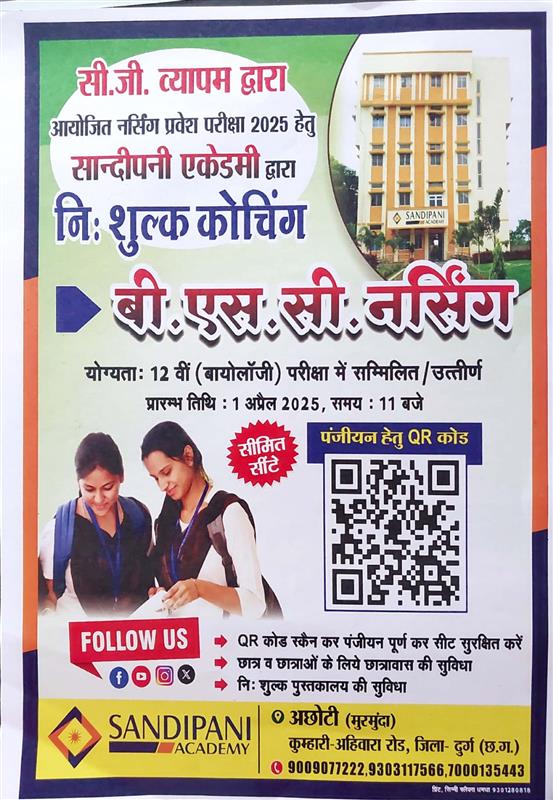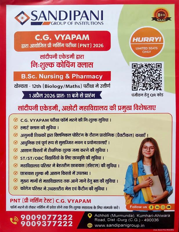 Sandipani Academy organizes free coaching for the competitive exams are conducted by CG VYAPAM. The courses includes PNT, PAT, B.Ed, B.Sc. B.Ed. B.A. B.Ed and D.El.Ed